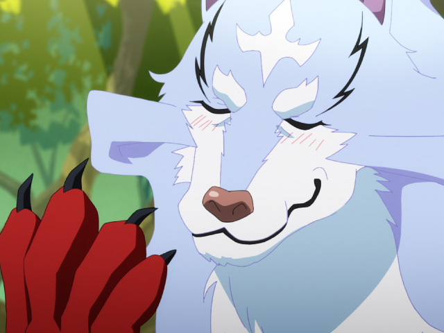 「レッドボアの生姜焼き」の匂いにつられたフェンリルはムコーダの前に姿を現し、従魔となる代わりに食事を提供するよう要求。強引に従魔契約を結ばせ、「フェル」と命名される。